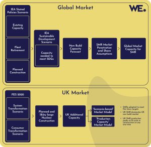 The research explored the global market for SMRs and produced estimates of the global market share of a UK SMR design (utilising International Energy Agency and NESO Future Energy Scenarios). Assessment of the market for SMR technologies was based on scenario modelling (including sensitivity analysis informed by discussions with the industry), estimating both the global and the UK markets for nuclear generated capacity (including new build capacity). Applying speed of market penetration and market share assumptions on these estimates provided an assessment of the market for SMR capacity. Market share assumptions for UK SMR in the wider SMR market were then used to estimate the potential market value of UK SMR exports.