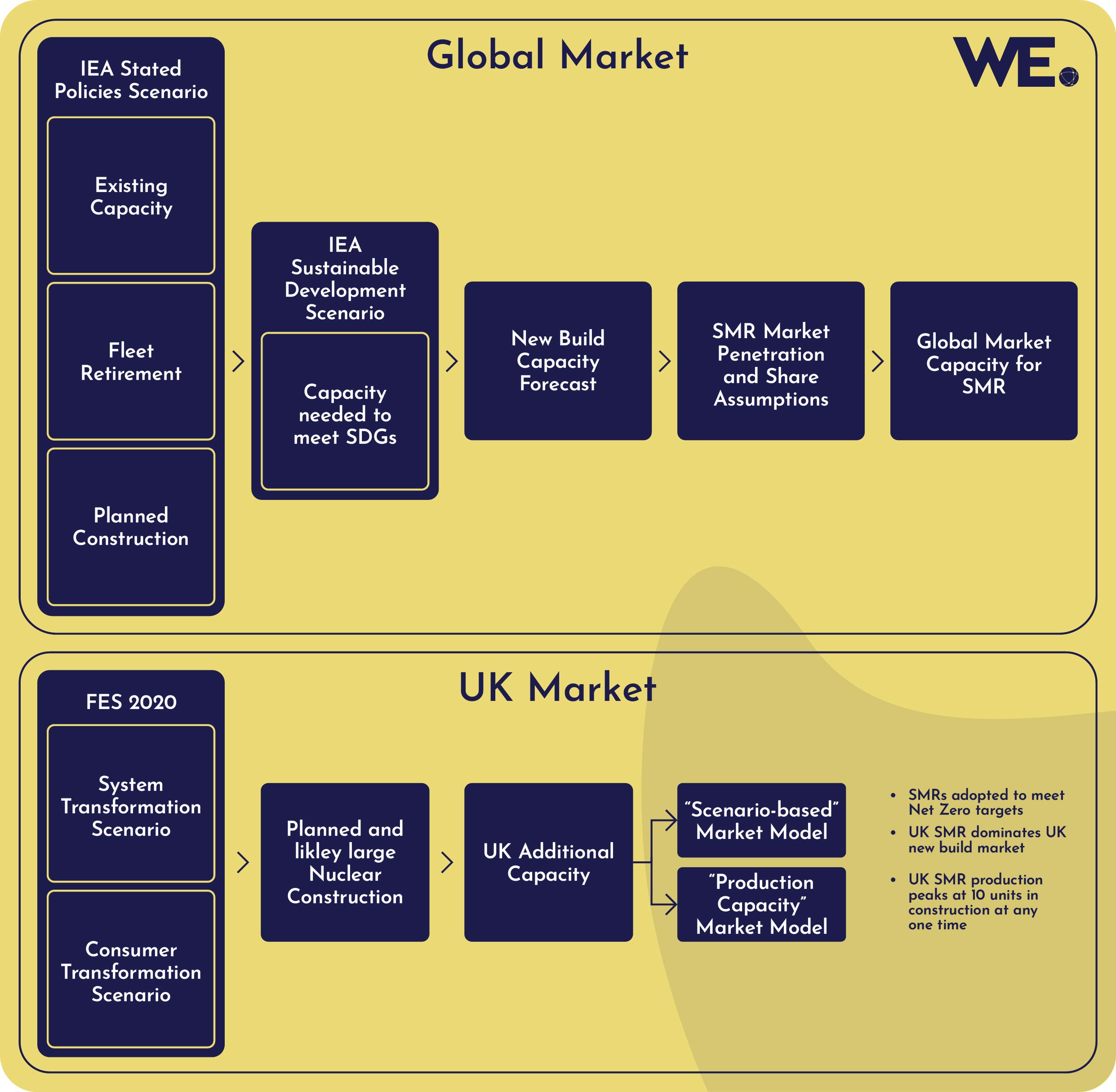 The research explored the global market for SMRs and produced estimates of the global market share of a UK SMR design (utilising International Energy Agency and NESO Future Energy Scenarios). Assessment of the market for SMR technologies was based on scenario modelling (including sensitivity analysis informed by discussions with the industry), estimating both the global and the UK markets for nuclear generated capacity (including new build capacity). Applying speed of market penetration and market share assumptions on these estimates provided an assessment of the market for SMR capacity. Market share assumptions for UK SMR in the wider SMR market were then used to estimate the potential market value of UK SMR exports.